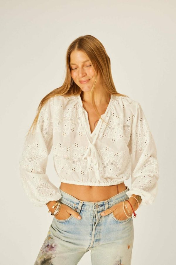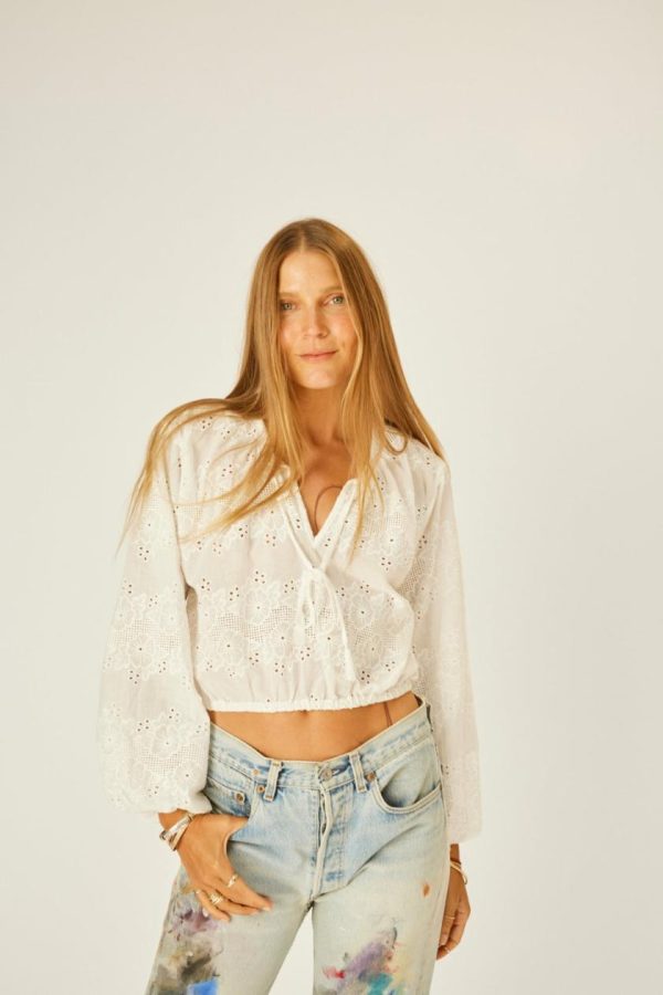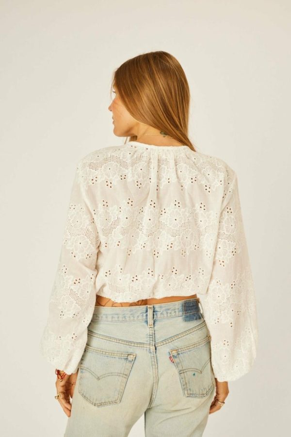 Cropped long-sleeve top with v-neckline and tie closure.