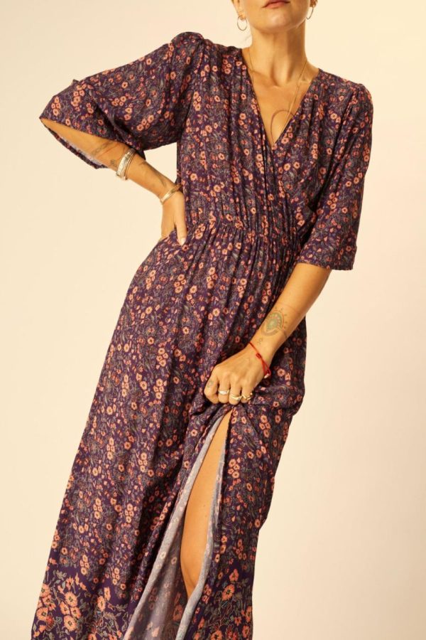 Crossover bodice with thin elastic waist forming soft gathers at mid section.