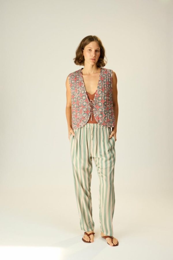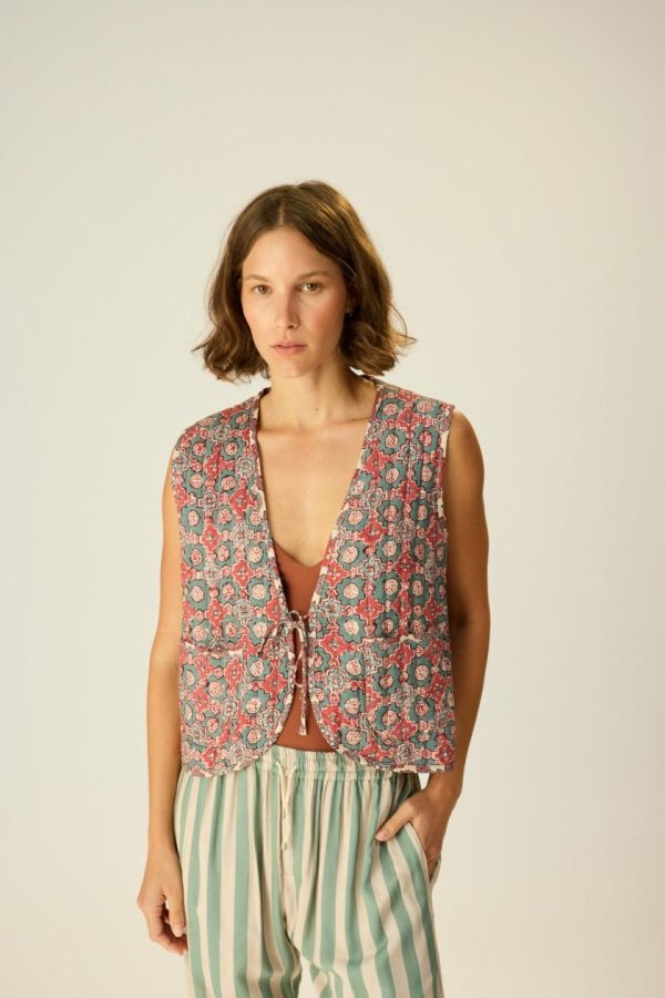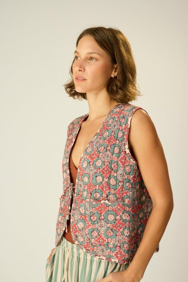 Fully reversible quilted vest with tie detailing at the front.