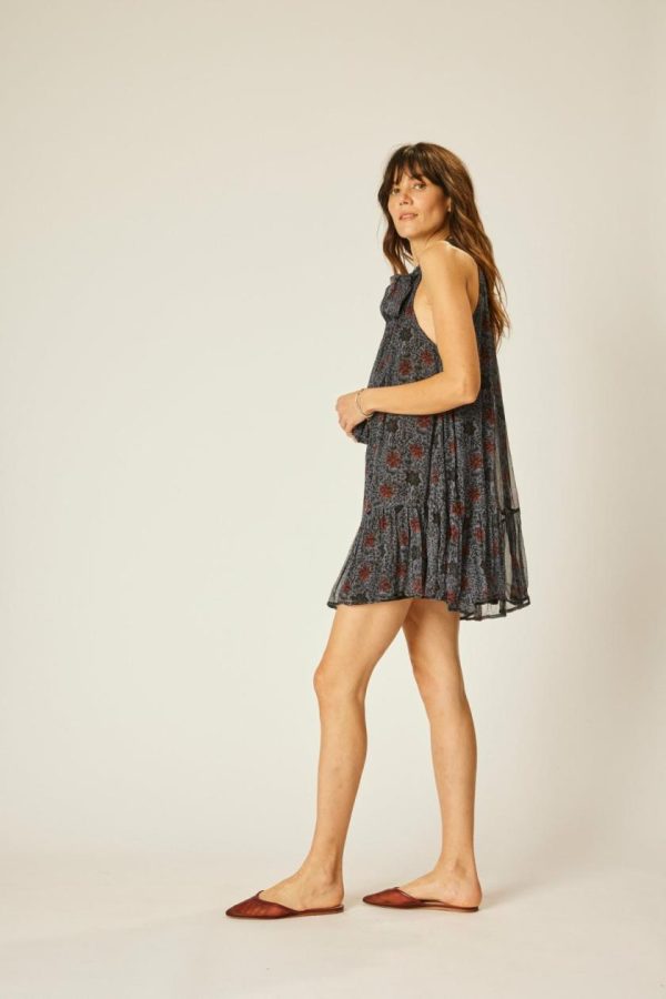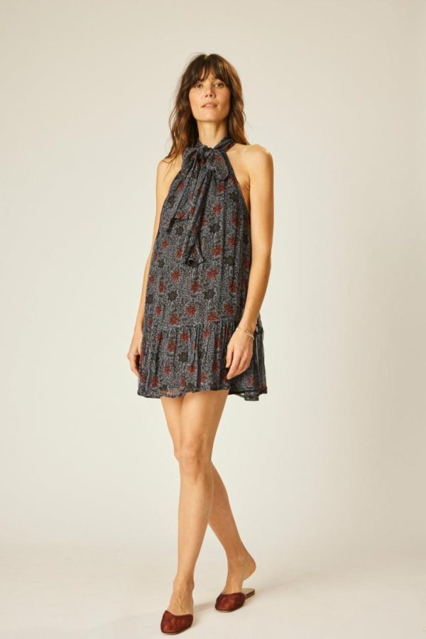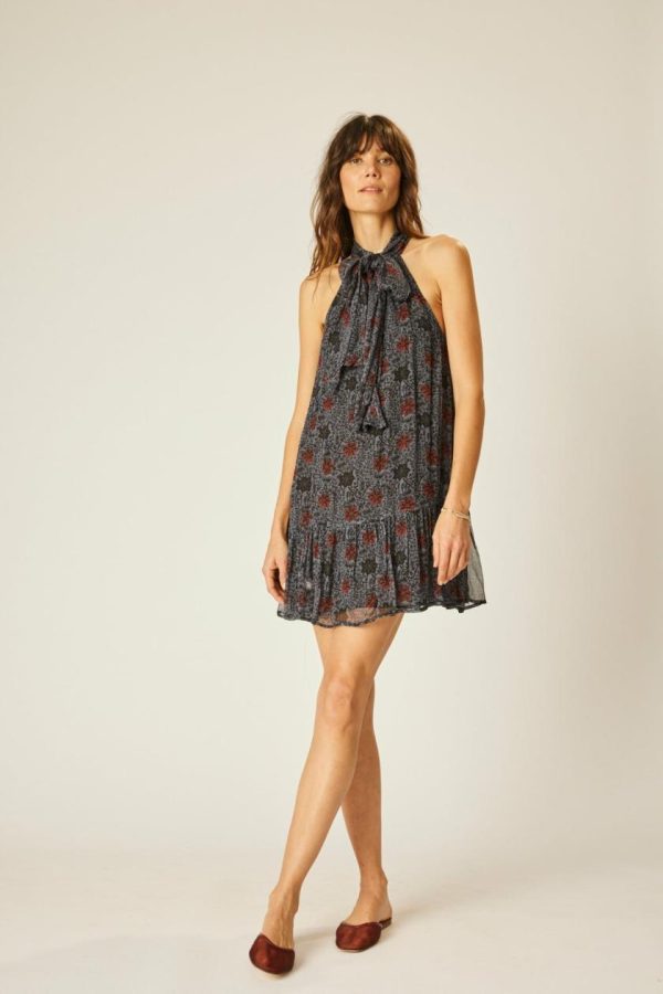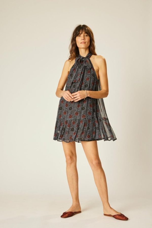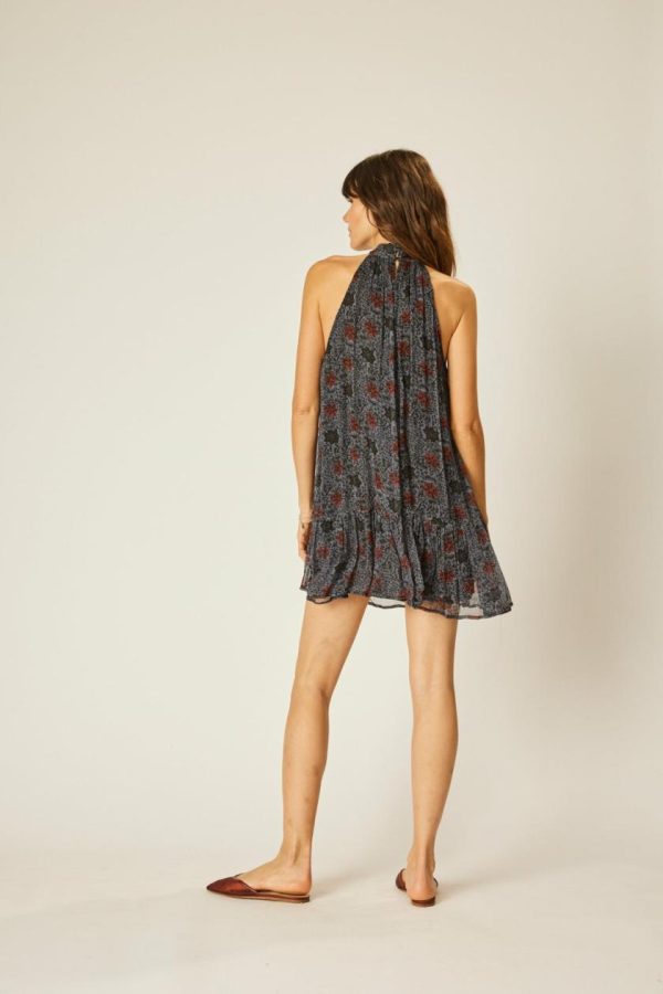 Mini length dress with buttoned halter neck.
