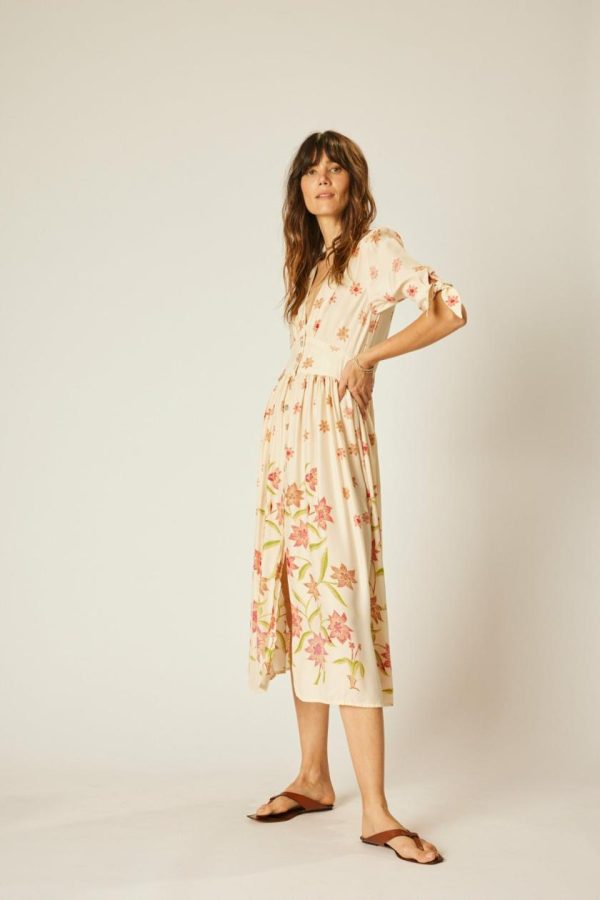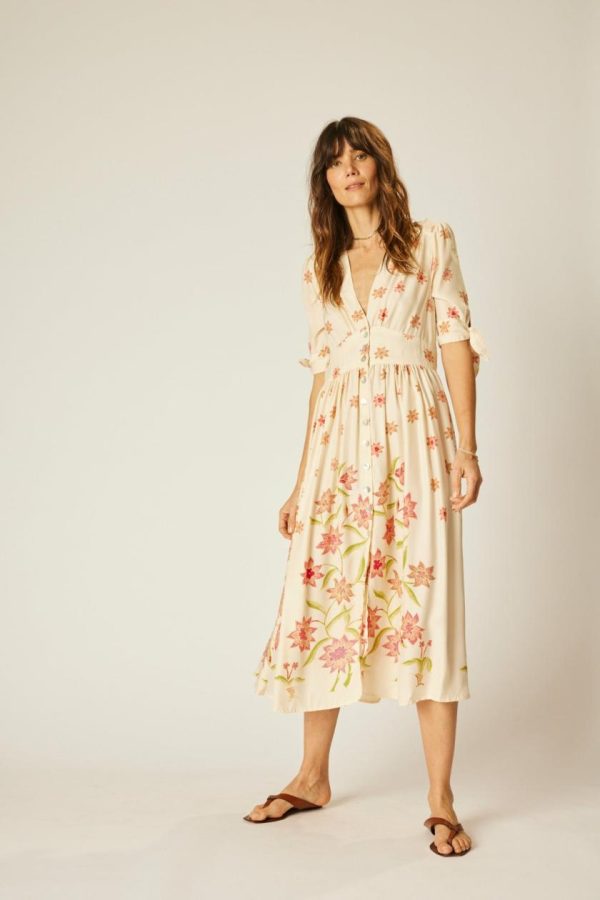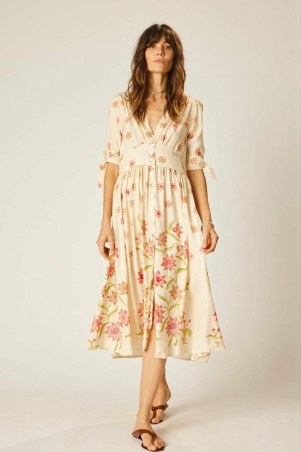 Maxi dress with v-neckline and shell buttons all down the front.