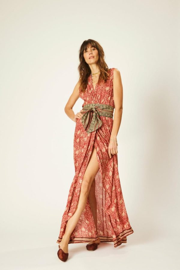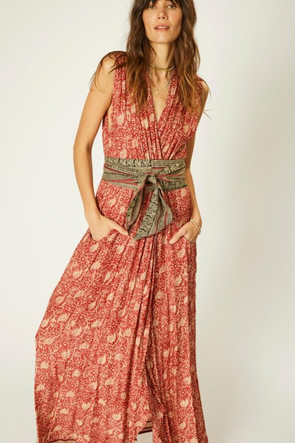 Sleeveless maxi dress with double snap closure across elastic waist.
