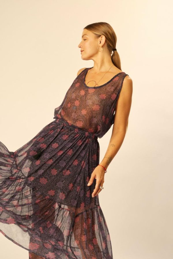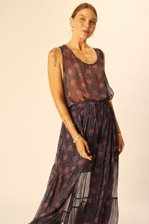 Full, tiered maxi skirt with elastic and drawstring waist.